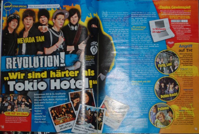 С миксами из панка, метала, хип хопа и рока, тяжелыми и честными немецкими текстами Nevada Tan захватывают чарты и фанатские сердца… «Nevada Tan – лучшие!»…глаза Medine(15) светятся от восторга, когда она со своей подругой Sofia(14) обклеивает плакатами свою комнату. Несколько месяцев назад там висели постеры с Биллом, Томом, Густавом и Георгом – сейчас же она собирает каждую бумажку с Франки, T:mo & Co. Дни Tokio Hotel сочтены и Nevada Tan – новые «номер один»? Факт остается фактом: во время последнего тура ТН, далеко не все билеты были распроданы, а фанатов NT с каждым днем становиться все больше. Tokio Hotel и Nevada Tan похожи: обе группы состоят из молодых музыкантов, которые с самого детства уже были связаны с музыкой. Названия обеих групп связано с Японией – Nevada Tan – это псевдоним японской девочки, которая в 11 лет зарезала свою одноклассницу( не удержаться от комментов…блин….слов нет….простите но ненавязчивое Tokio Hotel звучит как-то немного лучше…да и дружелюбней… - прим. Bestehen_fUr_dich) «Мы не хотим проставлять свои поступки»,- заявляет солист T:mo в интервью для журнала Hey! , «..наоборот, мы хотим показать, что получается из того, когда дети или молодые люди выставляют на показ себя и свои действия!» Каковы другие их совпадения с TH? Nevada Tan тоже затрагивают в своих песнях проблемы и желания их поколения, и поражают проникновенностью текстов своих молодых фанатов.